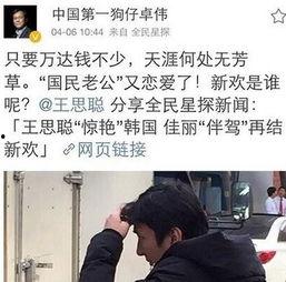 近日,卓伟在社交媒体上发布了一则消息,称自己独家爆料王思聪的新恋情。消息一出,立刻引起了网友们的热议。据卓伟透露,王思聪的新女友是一位年轻漂亮的网红,两人已经交往一段时间了。